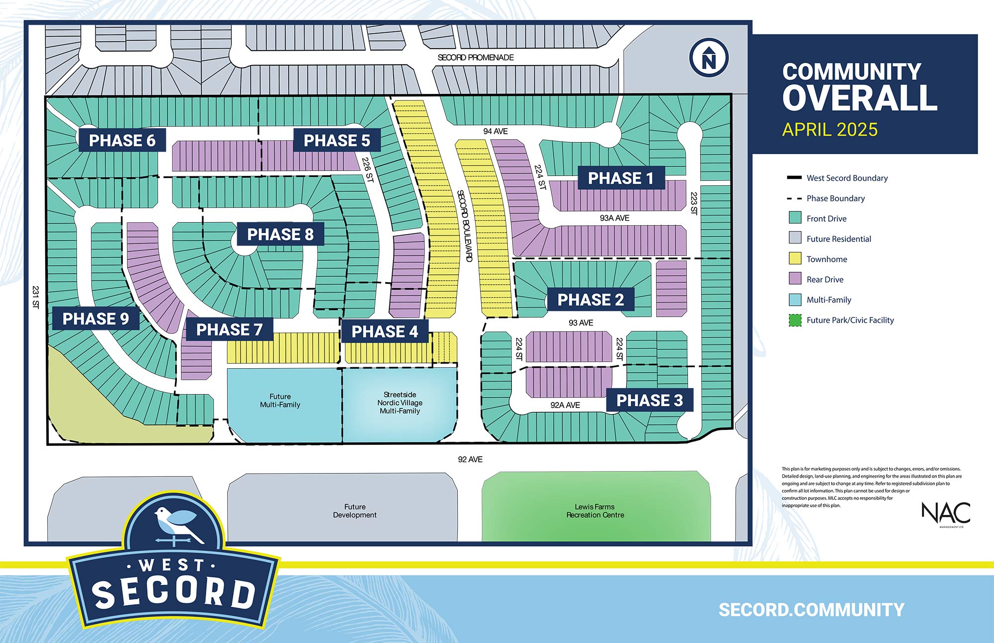 Secord Playground (Northeast) is located at Secord Blvd & 217 St, next to the Secord Wetland and includes swings, slides, and seating.